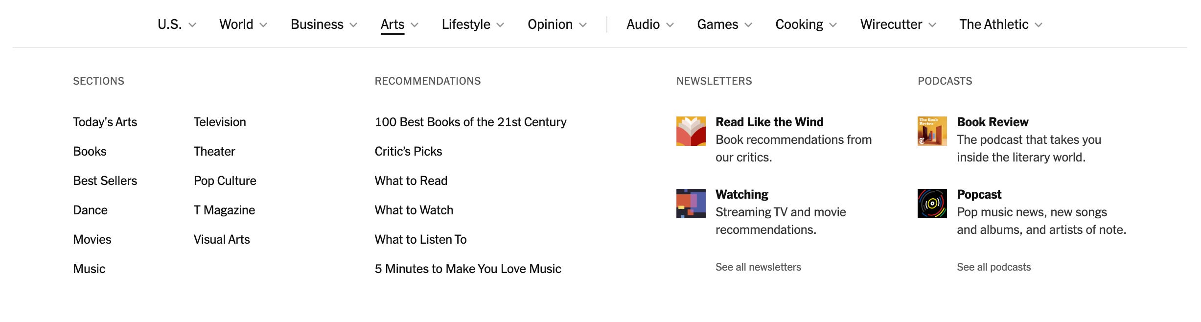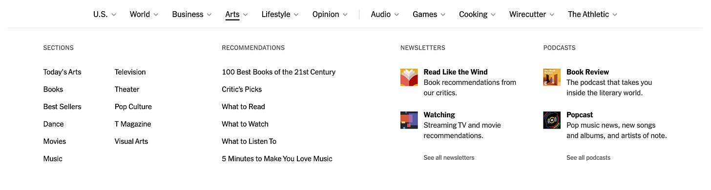 Google doesnât produce information, it just mediates access to it, and then sells ads on that traffic. But this version of aggregation theory worked out better for selling home goods and distributing music than it did for news media. In the years since then, most digital platforms have turned against news (which is to say, concrete, verified information about reality). Thereâs no universal marketplace for journalism or commentary, save perhaps a halfhearted sideline like Apple News.2 In the media industry, the new aggregators are very small scale, individual creators, or very large, like the NYT. The NYT homepage and app now function more like Twitter, but a self-contained Twitter written and produced entirely by the professional newsroom. There are dozens of little bits of content, 4 separate stories on every major subject to choose from, and sidebars of constantly updating Opinion takes on the news. (NYT also posts TikTok-esque vertical videos of its reporters on its homepage and app, as does WSJ.) It aggregates everything you need. This is what the menu under the Arts section of the NYT website looks like:Â