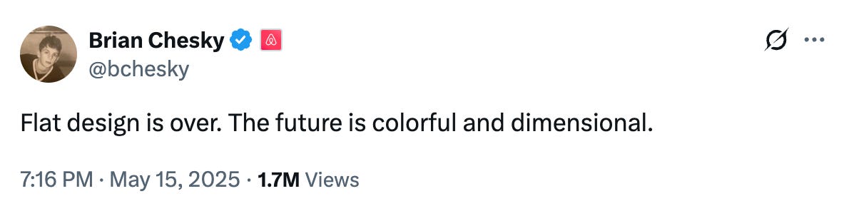 And yet! Any aesthetic innovation is relentlessly adopted and co-opted until it comes to signify its opposite. Weâll see more tech companies follow in Airbnbâs wake; a design entrepreneur on X already demonstrated how he used AI to replicate the skeuomorphic, rounded, animated icons, effortlessly whipping up a coffee machine. Care is also the opposite of automation; itâs a barista making a cappuccino with latte art for you by hand instead of a Nespresso machine pod. But AI makes automation almost irresistible. Itâs increasingly difficult to signify quality in any kind of visual or brand choice, because anyone can catch up to you more or less overnight.